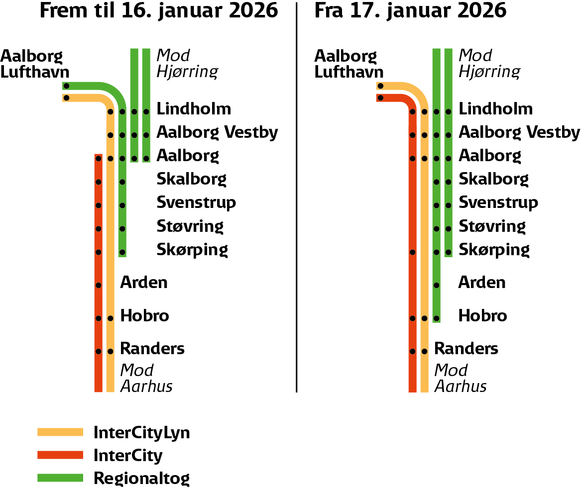 Vor dem Fahrplanwechsel am 14. Dezember 2025 verkehrten die InterCity-Züge zwischen Randers und Aarhus, die InterCityLine-Züge endeten am Flughafen Aalborg. Regionalzüge fuhren zwischen Skørping und Flughafen Aalborg. Nach dem Fahrplanwechsel wird der Flughafen ab dem 16. Januar 2026 nur noch von InterCity- und IntercityLine-Zügen bedient, die Regionalzüge werden über Skørping hinaus nach Hobro verlängert.[13]