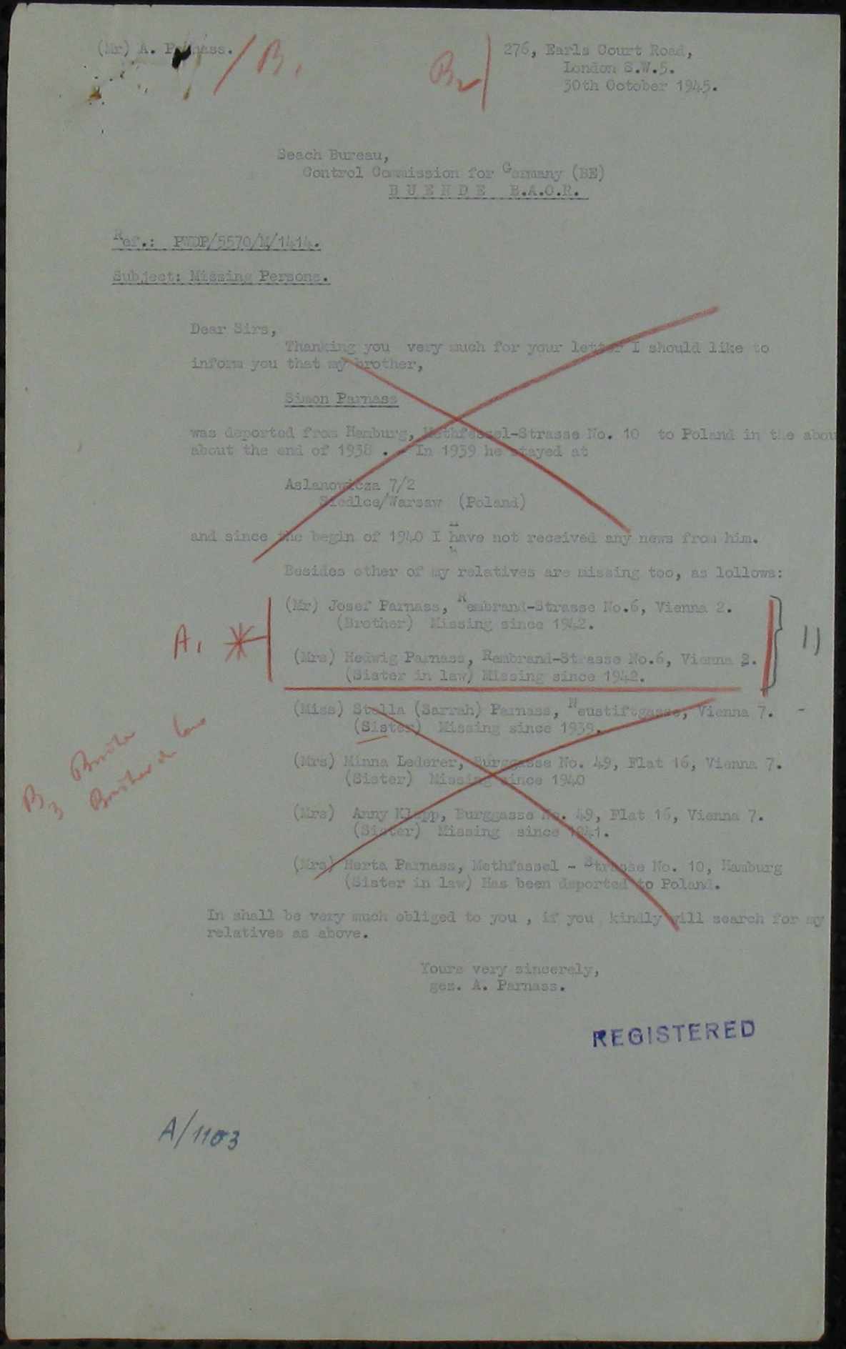 - ↑ Adolf Abraham Parnass in London: Missing Persons. Arolsen Archiv, 20. Oktober 1945, abgerufen am 2. Januar 2026.