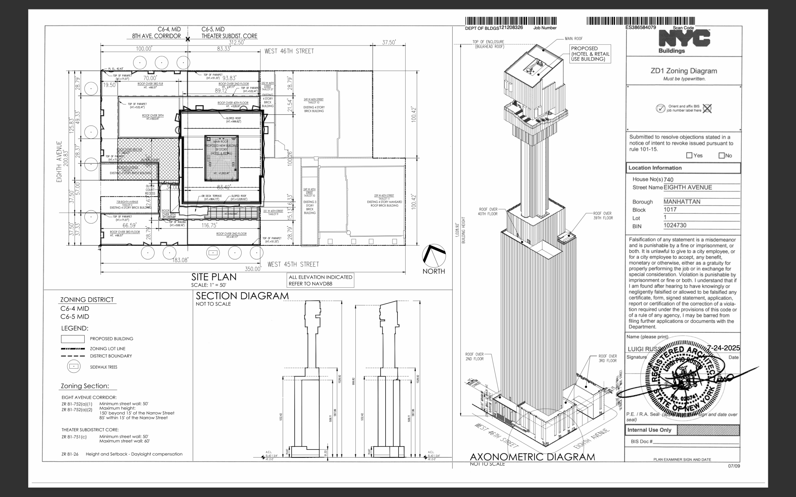 - ↑ The Torch Continues to Rise at 740 Eight Avenue in Times Square – 740 Eight Avenue, Zonendiagramm 24. Juli 2025. In: New York City Buildings/New York Yimby. Abgerufen am 25. Dezember 2025.