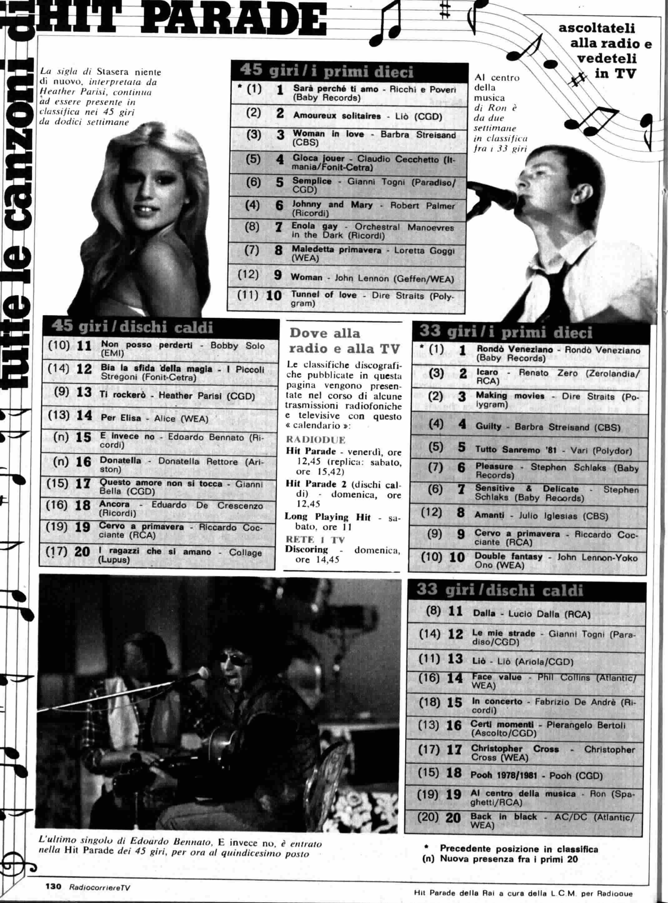 - ^ LCM Radio Due (1981). "Hit parade: 33 giri/i primi dieci". Radiocorriere TV. No. 18.